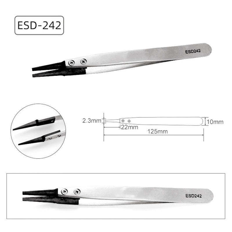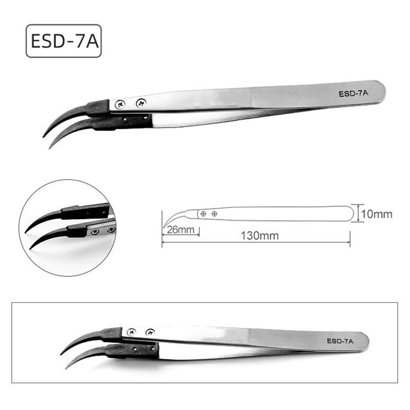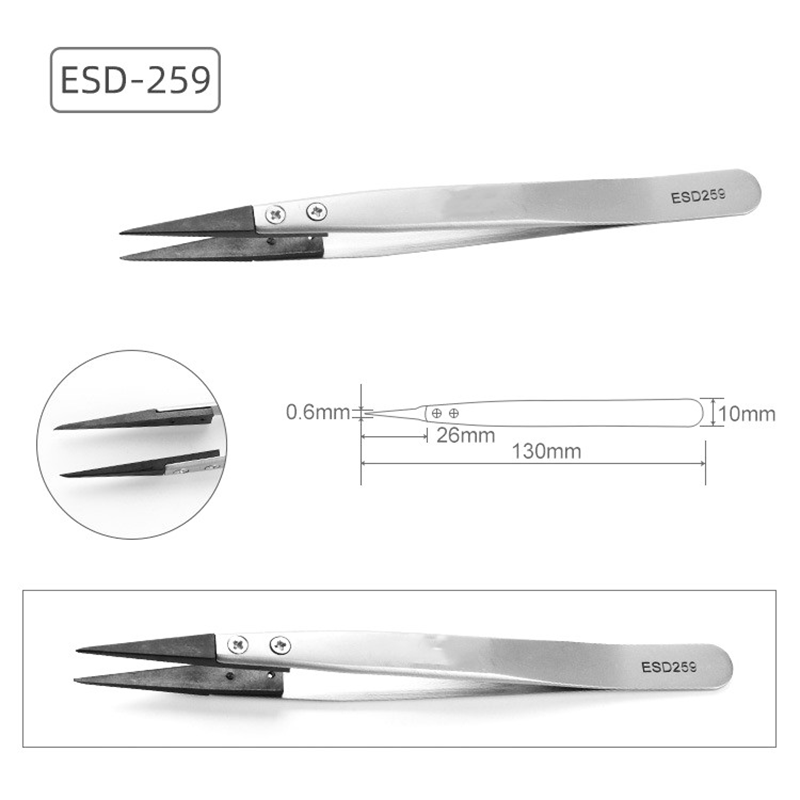 Ang ulo ng tweezers ay gawa sa isang halo ng carbon fiber at espesyal na plastik, na maaaring epektibong maiwasan ang static na akumulasyon ng kuryente at magbigay ng isang ligtas na kapaligiran sa operating para sa mga static na sensitibong sangkap.